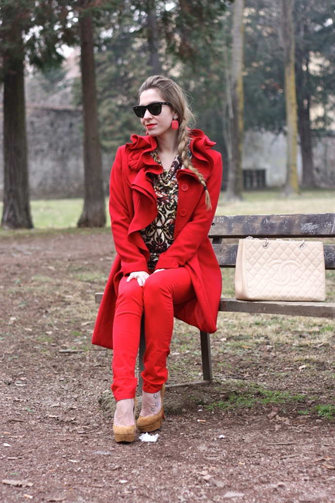Here some photos taken just before going to the lake for a walk with my dog, just before changing my shoes (blessed are the Isabel Marant!). Despite the weather, I have chosen to wear something very colorful, an “almost total red look” combined with my mood, happy and bubbly. Have a good week guys.