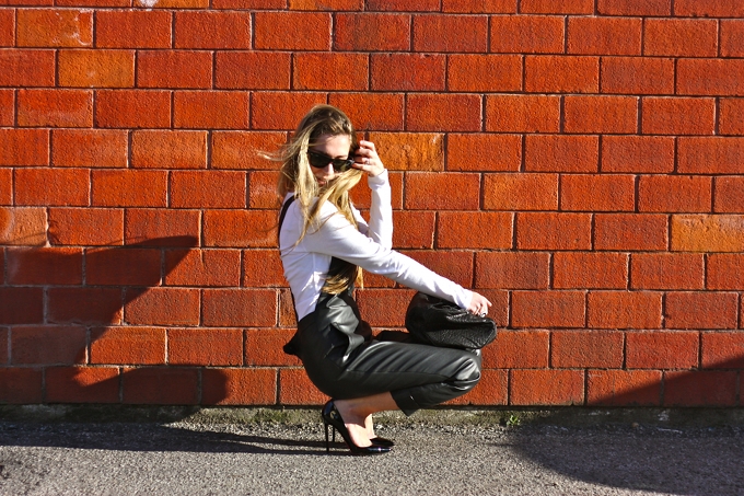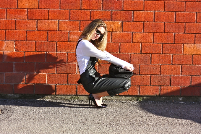 Faux leather dungarees: Asos. Shoes:Christian Louboutin. Bag:Alexander Wang. T-shirt:OVS. Necklace:Bought in Cortina. Ring:Bought in Porto Cervo.