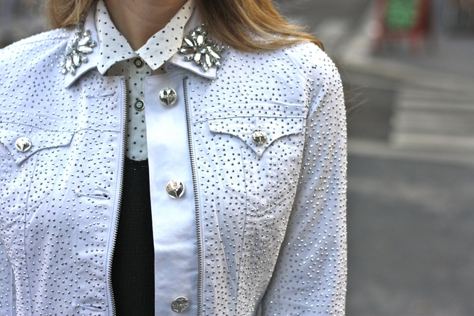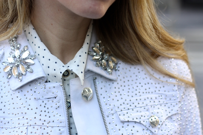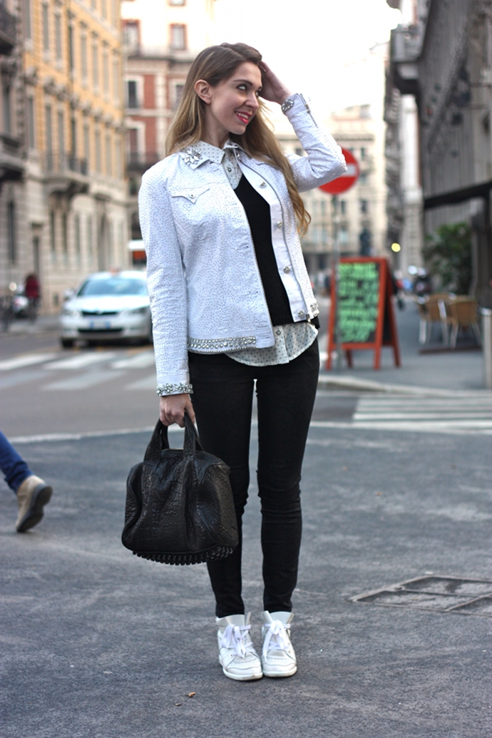 Hello guys, while I’m writing I’m at home, at the lake. Yesterday I left my apartment in Milan and came back home (sigh!). But there was one thing I had not yet shown, the last outfit of the last day of fashion week. After six days of extravagant outfits and high heels I focused on simplicity (and my feet thank this!): Jeans, sneakers by Isabel Marant and this fantastic studded denim jacket from Lerock. Without forgetting this cute shirt with polka dots from Prada bought in a outlet near my hometown. It ‘s true that sometimes you can find some amazing pieces, you just have to look a bit’. I love it even online shopping at outlet online, if you come at the right time you can find cool stuff for an incredible prices. My Favorites? The Outnet, Yoox, but also Groupon. I’m going to do a post about it, what do you think?