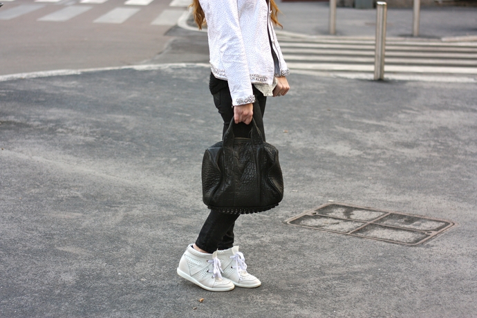 Buongiorno ragazzi, mentre vi sto scrivendo mi trovo a casa, al lago. Ho lasciato ieri il mio monolocale a Milano e sono tornata (sigh!). Ma c’era una cosa che ancora non vi avevo mostrato, l’ultimo outfit dell’ultima di giornata di fashion week. Dopo sei giorni di tacchi e outfit stravaganti ho puntato sulla semplicità (e i miei piedi ringraziano!): Jeans, le sneakers di Isabel Marant e questa fantastica giacca di jeans borchiata di Lerock. Senza dimenticarci della camicia a pois di Prada presa in un outlet vicino alla mia città. E’ proprio vero che a volte si trovano dei pezzi incredibili, bisogna solo cercare un po’. Mi piace moltissimo anche fare shopping in outlet online, se arrivi al momento giusto trovi delle vere chiccherie a dei prezzi incredibili. I miei preferiti? The Outnet, Yoox, ma anche Groupon. Ho intenzione di fare un post a riguardo, cosa ne dite?