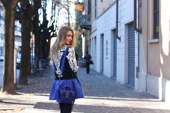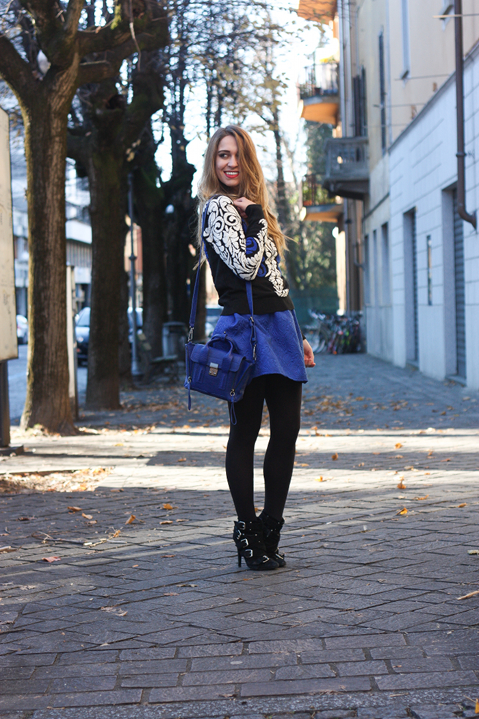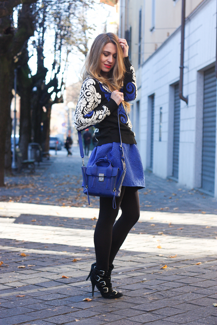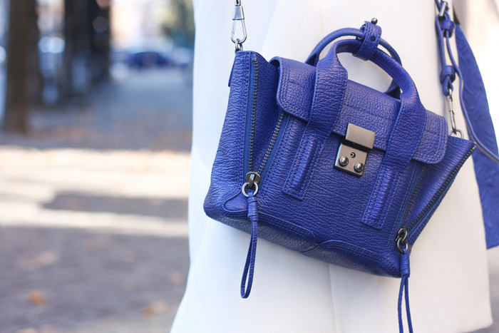 Ma prima di mostravi tutto questo, vi mostro un outfit che mi piace particolarmente. Blu e nero con un pizzico di bianco. La vera protagonista di questo look è la mini Pashli di 3.1 Phillip Lim, una mini bag a tracolla di cui mi sono innamorata quasi subito. Mi piace il punto di blu, il fatto che abbia una tracolla che la renda super pratica e comoda, l’adoro!