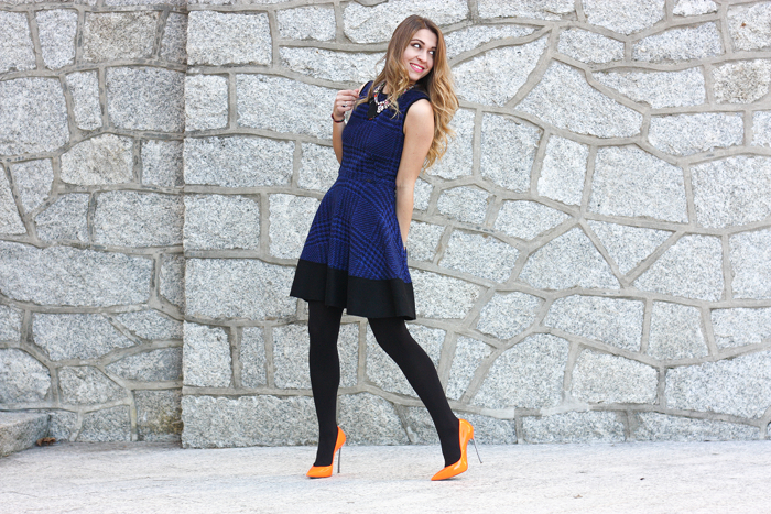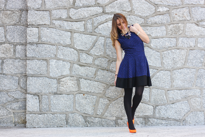 Un vestitino tartan blu, delle scarpe fluo e la mia collana preferita: quella di Shourouk. Unica, vistosa ma incredibilmente chic! L’ho trovata su Monnier Frères e me ne sono subito innamorata.