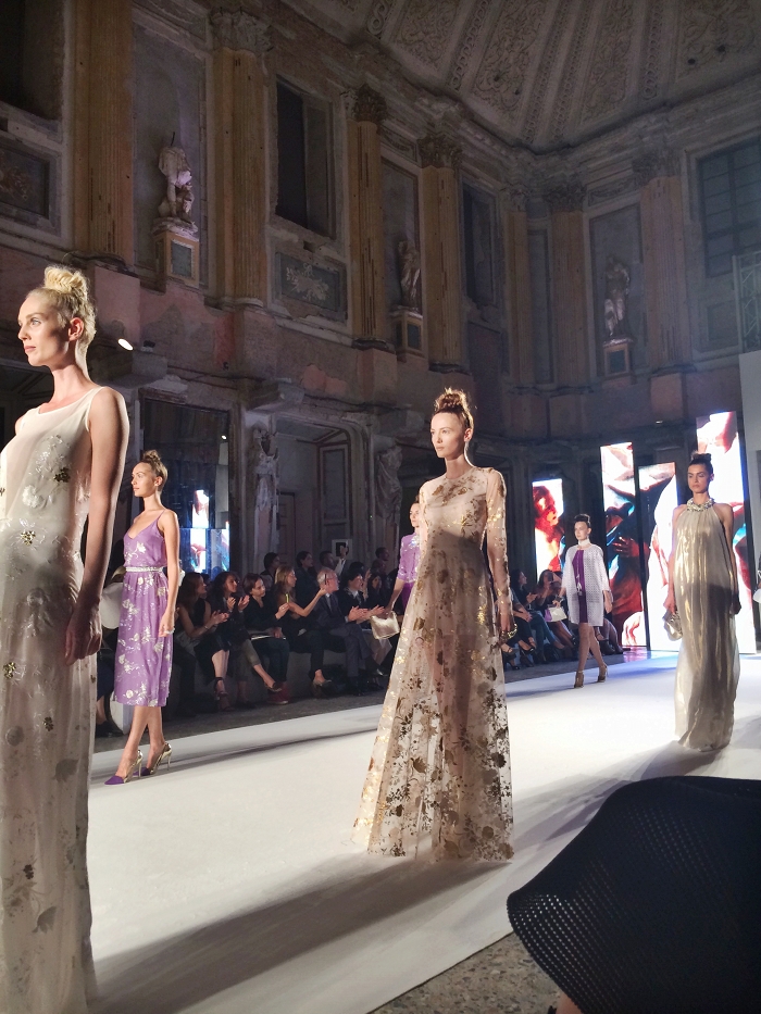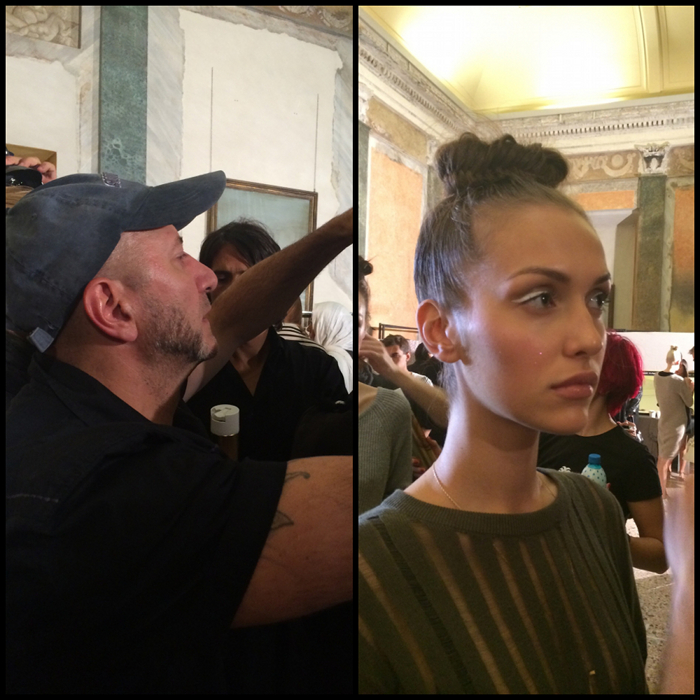 Da Mila Schon invece, troviamo una coda bassa, fermata da un nodo che lo stilista riprende nei capi della collezione. Peter Gray si è ispirato proprio a questo quando ha creato l’hairstyle per questa sfilata. Una coda bassa, con diversi volumi sulla nuca e fermata proprio da questo riconoscibile nodo. Per preparare la base del capelli è stato utilizzato Constructor spray e il finish è dato dalla sensazionale lacca Elnett.