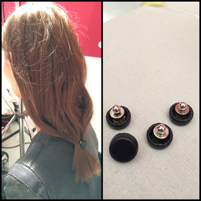 Per Gabriele Colangelo l’hairstylist di rifermento è di nuovo Peter Gray. Ci spiega che i capelli sono leggermente mossi e voluminosi grazie a Construction spray e fermati sulle punte elastico e impreziositi con orecchini metallici, quasi fossero dei piccoli bottoni. Nella parte frontale, sul viso, l’effetto è quasi lifting, molto tirato grazie a Elnett.