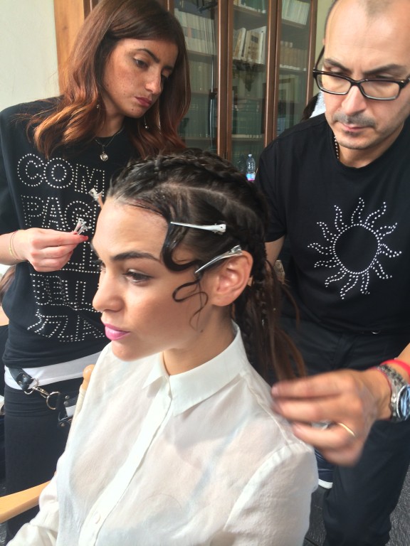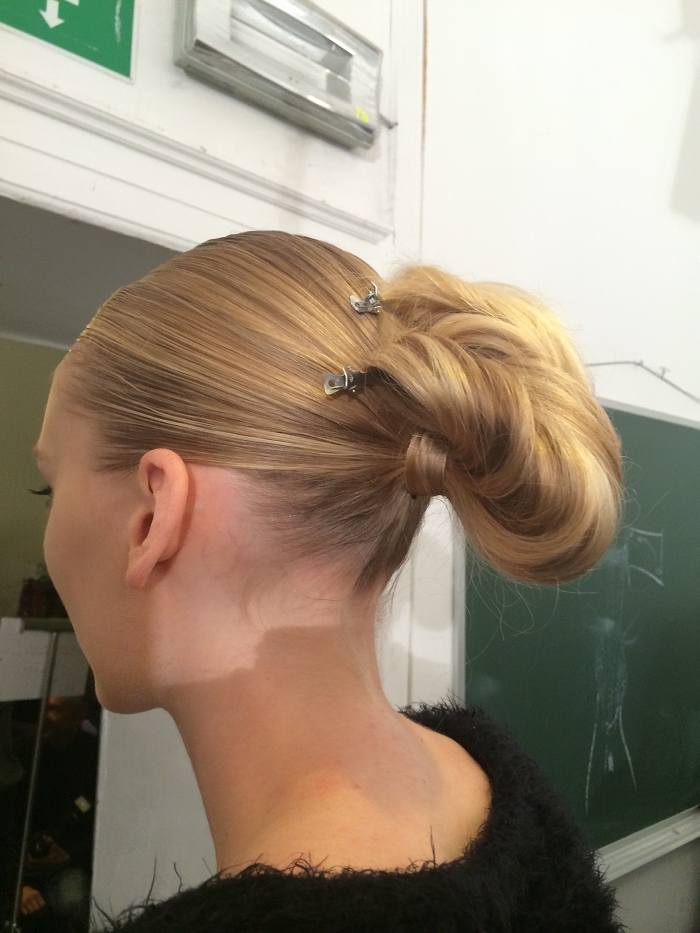 Da Aigner ho incontrato una mia vecchia conoscenza: il bravissimo Franco Curletto. La sua ispirazione è una donna settecentesca, quasi ecclesiastica. Capelli mat ottenuti con la mousse alla radice che permette di dare consistenza e volume con Volume Lift di L’Oréal Professionnel e Spray a Porter di Kérastase. La coda viene composta da una treccia e raccolta per un effetto scultoreo. L’acconciatura è molto disciplinata nella parte frontale e più destrutturata sul back, il finish è dato dall’ormai iconica lacca Elnett.
