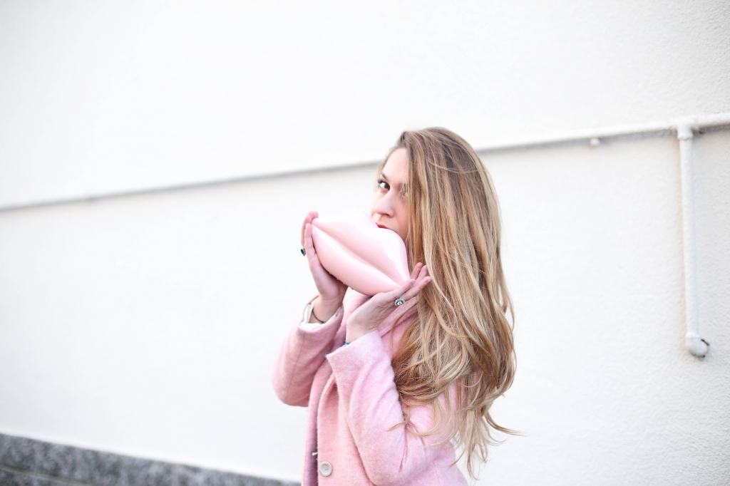 Ready for a stroll downtown in search of the ultimate Christmas gifts with a total black look only broken by the pink coat of Ottod’Ame and the lips clutch by Lulu Guinness, that I love so much. Have a sweet day, with a hint of pink to you! A kiss!
