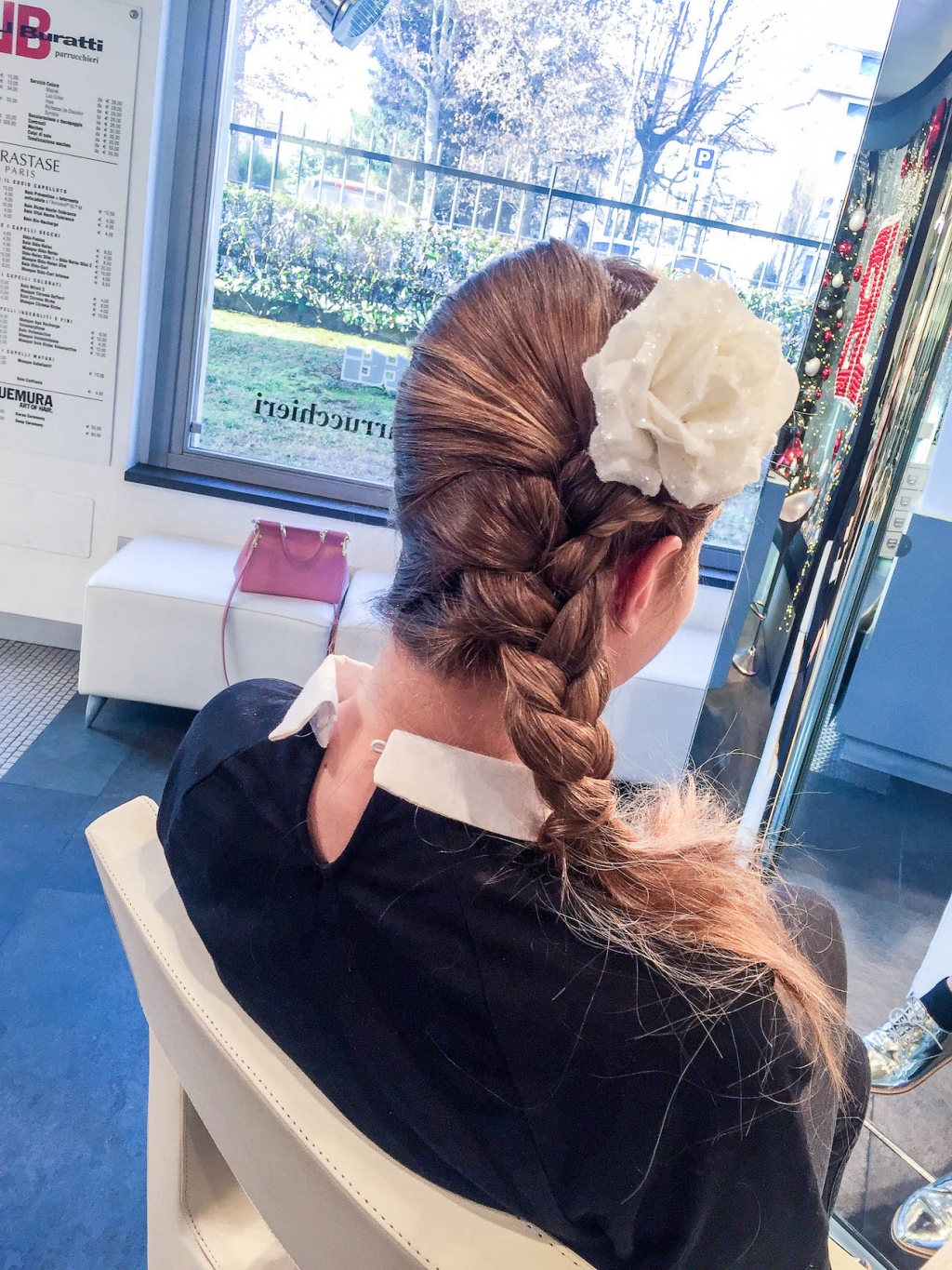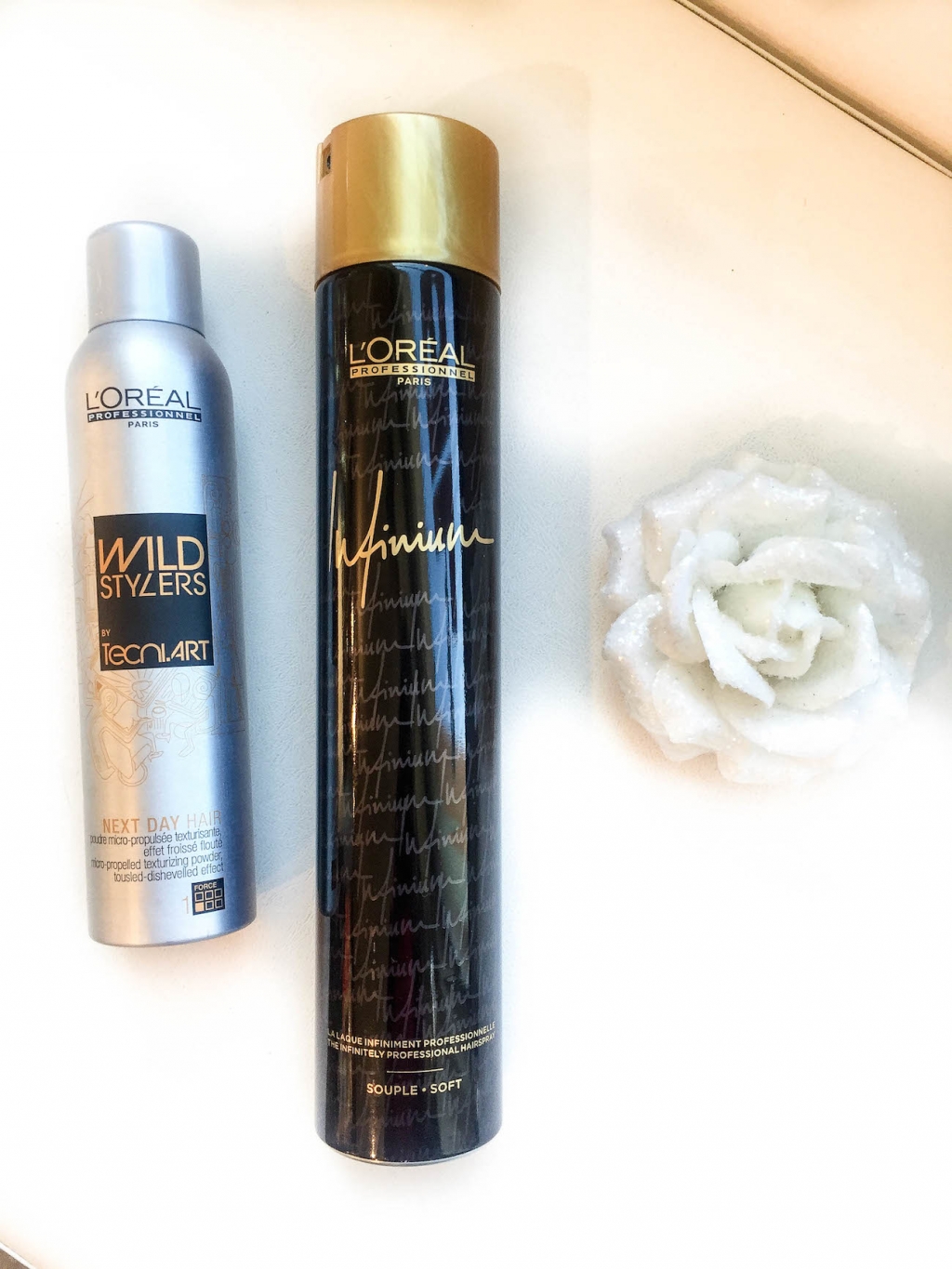 L’Oréal Professionnel Infinium per fissare il tutto. Immancabile un bel fiore grande, per essere davvero perfette!